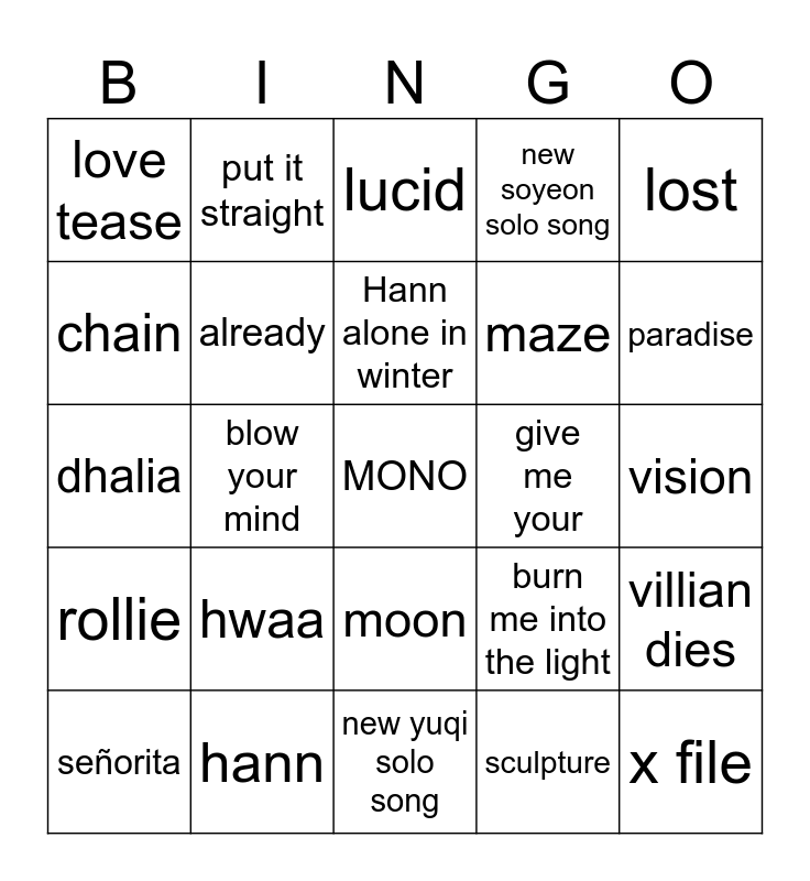 This bingo card has a free space and 24 words: hwaa, hann, Hann alone in winter, señorita, lost, love tease, chain, put it straight, give me your, moon, maze, dhalia, burn me into the light, villian dies, already, sculpture, vision, lucid, paradise, blow your mind, x file, rollie, new soyeon solo song and new yuqi solo song.