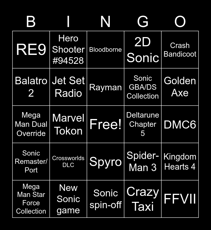 This bingo card has a free space and 24 words: Crossworlds DLC, New Sonic game, Rayman, Mega Man Star Force Collection, Crash Bandicoot, RE9, Balatro 2, Hero Shooter #94528, Deltarune Chapter 5, Spyro, Sonic GBA/DS Collection, Mega Man Dual Override, Spider-Man 3, Kingdom Hearts 4, Jet Set Radio, Crazy Taxi, DMC6, Bloodborne, Golden Axe, Marvel Tokon, FFVII, Sonic Remaster/ Port, 2D Sonic and Sonic spin-off.
