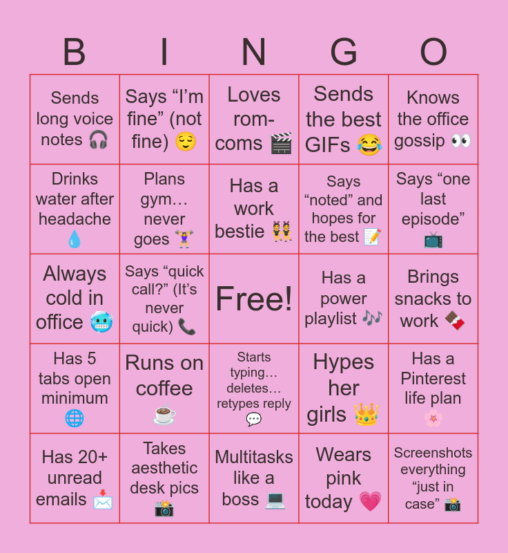 This bingo card has a free space and 24 words: Has 20+ unread emails πŸ“©, Runs on coffee β˜•, Has a work bestie πŸ‘―, Wears pink today πŸ’—, Knows the office gossip πŸ‘€, Sends long voice notes 🎧, Says β€œI’m fine” (not fine) 😌, Loves rom-coms 🎬, Has a power playlist 🎢, Brings snacks to work 🍫, Always cold in office πŸ₯Ά, Plans gym… never goes πŸ‹οΈβ€β™€οΈ, Hypes her girls πŸ‘‘, Has a Pinterest life plan 🌸, Drinks water after headache πŸ’§, Takes aesthetic desk pics πŸ“Έ, Multitasks like a boss πŸ’», Sends the best GIFs πŸ˜‚, Says β€œone last episode” πŸ“Ί, Has 5 tabs open minimum 🌐, Says β€œquick call?” (It’s never quick) πŸ“ž, Starts typing… deletes… retypes reply πŸ’¬, Says β€œnoted” and hopes for the best πŸ“ and Screenshots everything β€œjust in case” πŸ“Έ.