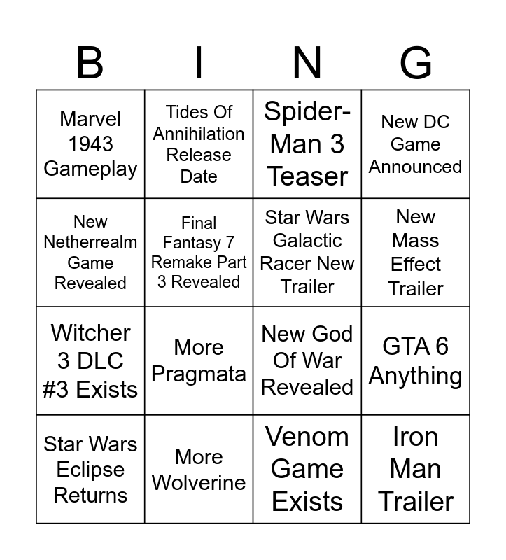 This bingo card has 16 words: More Wolverine, GTA 6 Anything, Spider-Man 3 Teaser, Marvel 1943 Gameplay, Witcher 3 DLC #3 Exists, Tides Of Annihilation Release Date, New God Of War Revealed, Venom Game Exists, New Netherrealm Game Revealed, Final Fantasy 7 Remake Part 3 Revealed, Star Wars Eclipse Returns, New DC Game Announced, More Pragmata, New Mass Effect Trailer, Star Wars Galactic Racer New Trailer and Iron Man Trailer.