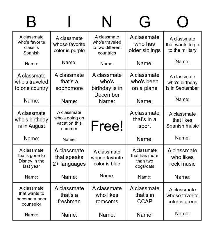 This bingo card has a free space and 24 words: A classmate that speaks 2+ languages Name:, A classmate that's a freshman Name:, A classmate who's birthday is in December Name:, A classmate that wants to become a peer counselor Name:, A classmate that wants to go to the military Name:, A classmate who's favorite class is Spanish Name:, A classmate who's traveled to one country Name:, A classmate whose favorite color is purple Name:, A classmate that's in a sport Name:, A classmate whose favorite color is blue Name:, A classmate who's been on a plane Name:, A classmate who's birthday is in August Name:, A classmate that has more than two dogs/cats Name:, A classmate who likes rock music Name:, A classmate that's a sophomore Name:, A classmate that's in CCAP Name:, A classmate that likes Spanish music Name:, A classmate who's traveled to two different countries Name:, A classmate who's birthday is in September Name:, A classmate who's going on vacation this summer Name:, A classmate whose favorite color is green Name:, A classmate that's gone to Disney in the last year Name:, A classmate who has older siblings Name: and A classmate who likes romcoms Name:.
