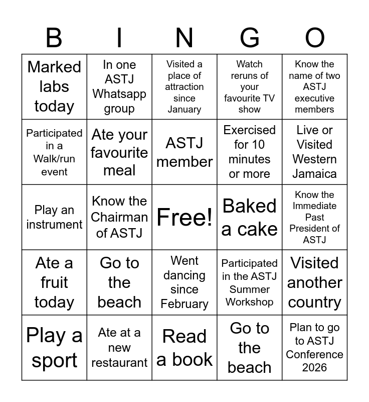 This bingo card has a free space and 25 words: Go to the beach, Read a book, ASTJ member, Play a sport, Know the name of two ASTJ executive members, Marked labs today, Participated in a Walk/run event, In one ASTJ Whatsapp group, Baked a cake, Went dancing since February, Exercised for 10 minutes or more, Play an instrument, Participated in the ASTJ Summer Workshop, Visited another country, Ate your favourite meal, Watched a movie, Know the Immediate Past President of ASTJ, Visited a place of attraction since January, Live or Visited Western Jamaica, Know the Chairman of ASTJ, Plan to go to ASTJ Conference 2026, Ate at a new restaurant, Ate a fruit today, Watch reruns of your favourite TV show and Go to the beach.