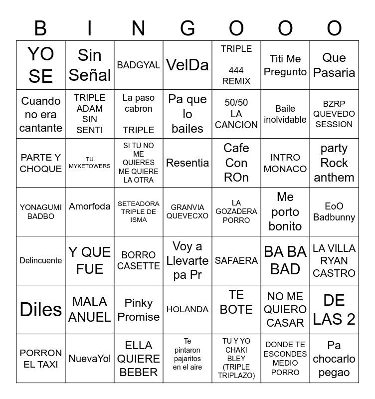 This bingo card has a free space and 48 words: TE BOTE, Baile inolvidable, Te pintaron pajaritos en el aire, Amorfoda, SI TU NO ME QUIERES ME QUIERE LA OTRA, EoO Badbunny, Sin Señal, NuevaYol, Titi Me Pregunto, Voy a Llevarte pa Pr, Que Pasaria, VelDa, INTRO MONACO, Cafe Con ROn, Diles, Me porto bonito, Cuando no era cantante, BZRP QUEVEDO SESSION, NO ME QUIERO CASAR, TRIPLE 444 REMIX, 50/50 LA CANCION, SETEADORA TRIPLE DE ISMA, YO SE, TRIPLE ADAM SIN SENTI, DE LAS 2, La paso cabron TRIPLE, party Rock anthem, PORRON EL TAXI, Resentia, TU MYKETOWERS, DONDE TE ESCONDES MEDIO PORRO, LA GOZADERA PORRO, LA VILLA RYAN CASTRO, MALA ANUEL, YONAGUMI BADBO, SAFAERA, BA BA BAD, PARTE Y CHOQUE, BORRO CASETTE, Pinky Promise, Delincuente, Pa chocarlo pegao, BADGYAL, ELLA QUIERE BEBER, Pa que lo bailes, HOLANDA, Y QUE FUE and TU Y YO CHAKI BLEY (TRIPLE TRIPLAZO).