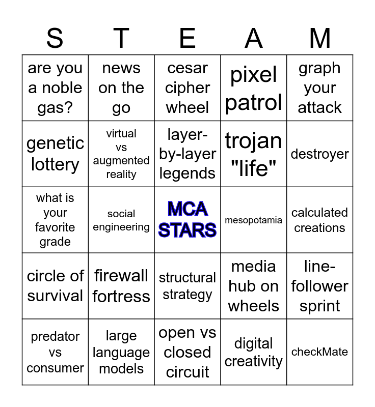 This bingo card has a free space and 29 words: chlorophyll vs chloroplast, large language models, cesar cipher wheel, history reimagined, graph your attack, are you a noble gas?, virtual vs augmented reality, layer-by-layer legends, mesopotamia, line-follower sprint, predator vs consumer, social engineering, digital creativity, checkMate, what is your favorite grade, make your mbot2 loop, open vs closed circuit, media hub on wheels, destroyer, circle of survival, firewall fortress, problem-solving strategies, trojan "life", calculated creations, genetic lottery, news on the go, structural strategy, pixel patrol and protect your queen.