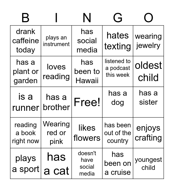 This bingo card has a free space and 24 words: Wearing red or pink, has a cat, has been to Hawaii, plays a sport, wearing jewelry, drank caffeine today, has a plant or garden, plays an instrument, has a dog, likes flowers, listened to a podcast this week, is a runner, has been out of the country, enjoys crafting, loves reading, has been on a cruise, has a sister, has social media, oldest child, has a brother, youngest child, reading a book right now, hates texting and doesn't have social media.