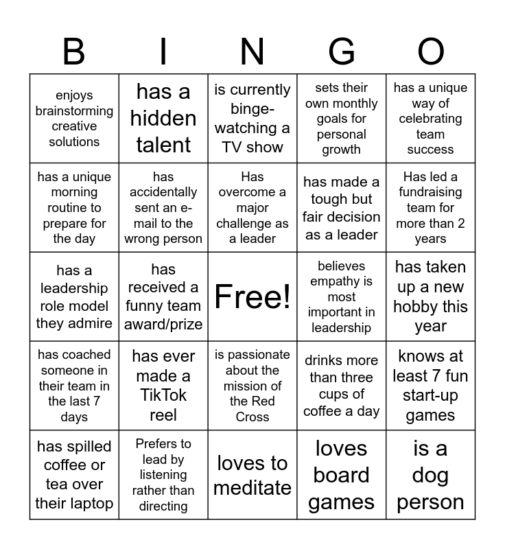 This bingo card has a free space and 24 words: has ever made a TikTok reel, Prefers to lead by listening rather than directing, Has overcome a major challenge as a leader, has spilled coffee or tea over their laptop, has a unique way of celebrating team success, enjoys brainstorming creative solutions, has a unique morning routine to prepare for the day, has a hidden talent, believes empathy is most important in leadership, is passionate about the mission of the Red Cross, has made a tough but fair decision as a leader, has a leadership role model they admire, drinks more than three cups of coffee a day, knows at least 7 fun start-up games, has accidentally sent an e-mail to the wrong person, loves board games, has taken up a new hobby this year, is currently binge-watching a TV show, Has led a fundraising team for more than 2 years, has received a funny team award/prize, is a dog person, has coached someone in their team in the last 7 days, sets their own monthly goals for personal growth and loves to meditate.