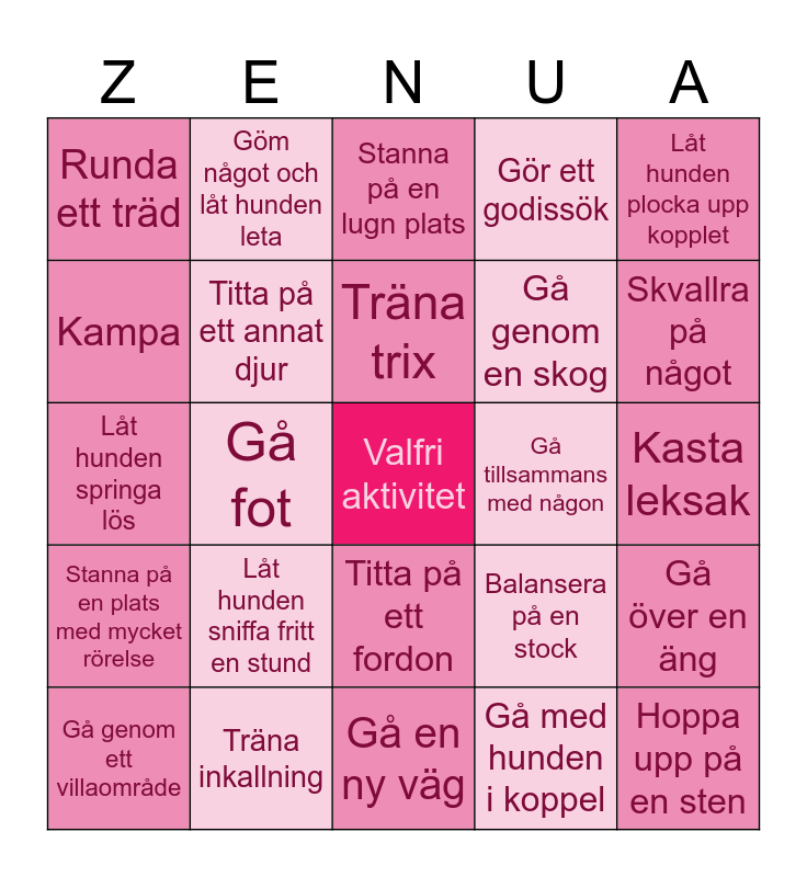 This bingo card has a free space and 24 words: Gå genom ett villaområde, Låt hunden sniffa fritt en stund, Träna trix, Gå med hunden i koppel, Låt hunden plocka upp kopplet, Runda ett träd, Göm något och låt hunden leta, Stanna på en lugn plats, Gå tillsammans med någon, Kasta leksak, Låt hunden springa lös, Titta på ett annat djur, Balansera på en stock, Gå över en äng, Kampa, Träna inkallning, Gå en ny väg, Gör ett godissök, Skvallra på något, Stanna på en plats med mycket rörelse, Gå fot, Titta på ett fordon, Gå genom en skog and Hoppa upp på en sten.
