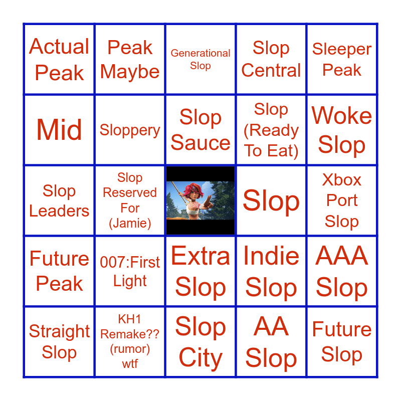 This bingo card has a free space and 24 words: 007:First Light, KH1 Remake?? (rumor) wtf, Slop Sauce, Straight Slop, Sleeper Peak, Actual Peak, Mid, Peak Maybe, Slop, Extra Slop, Slop (Ready To Eat), Slop Leaders, Indie Slop, AAA Slop, Sloppery, AA Slop, Xbox Port Slop, Generational Slop, Woke Slop, Slop Reserved For (Jamie), Future Slop, Future Peak, Slop Central and Slop City.
