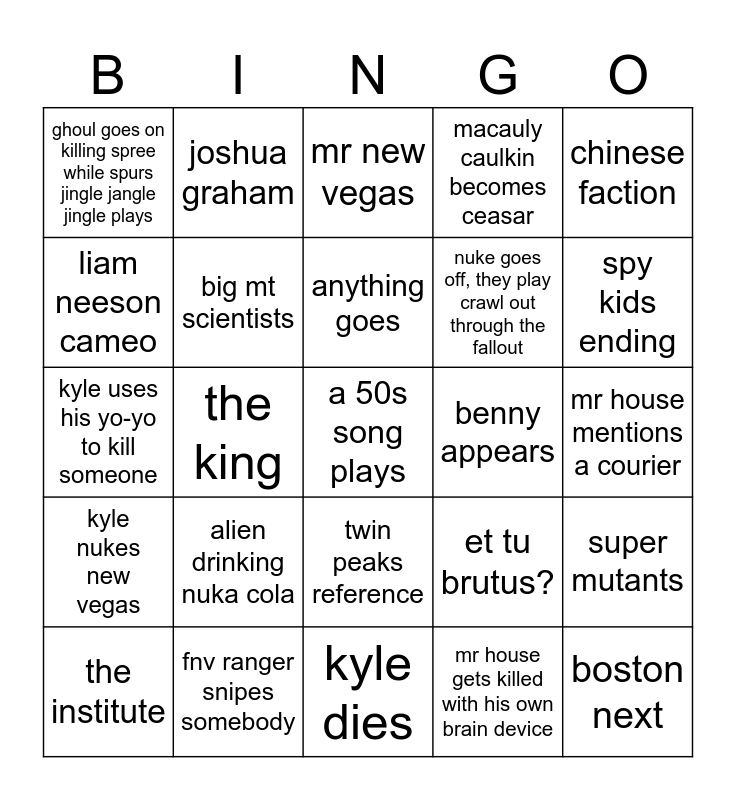 This bingo card has a free space and 24 words: alien drinking nuka cola, fnv ranger snipes somebody, anything goes, the institute, chinese faction, ghoul goes on killing spree while spurs jingle jangle jingle plays, liam neeson cameo, joshua graham, benny appears, twin peaks reference, nuke goes off, they play crawl out through the fallout, kyle uses his yo-yo to kill someone, et tu brutus?, super mutants, big mt scientists, mr house gets killed with his own brain device, mr house mentions a courier, mr new vegas, spy kids ending, the king, boston next, kyle nukes new vegas, macauly caulkin becomes ceasar and kyle dies.