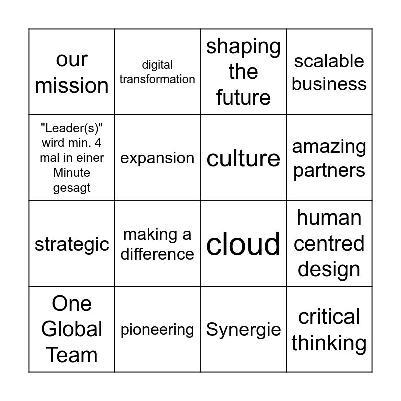 This bingo card has 21 words: pioneering, AI, digital transformation, SaaS, Synergie, culture, our mission, shaping the future, cloud, amazing partners, strategic, scalable business, critical thinking, double the business, expansion, global leadership, One Global Team, making a difference, "Leader(s)" wird min. 4 mal in einer Minute gesagt, human centred design and empowering.