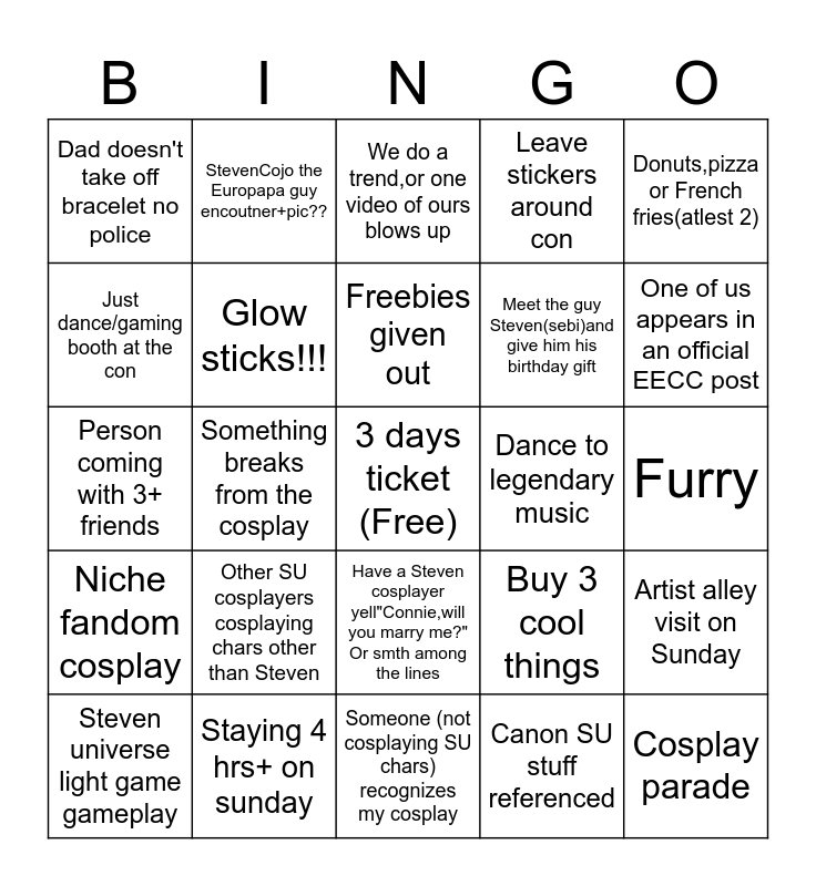 This bingo card has 1 images, a free space and 48 words: Pictures pls???????, Cosplay parade, Steven and the Stevens, Someone (not cosplaying SU chars) recognizes my cosplay, Other SU cosplayers cosplaying chars other than Steven, One of us appears in other cosplayer post, StevenCojo the Europapa guy encoutner+pic??, Jam song performance??, Just dance/gaming booth at the con, Metro ride with the unique metro citrus, Glow sticks!!!, Leave stickers around con, Artist alley visit on Sunday, Buy 3 cool things, I don't spill any food on the way there, A planned Skit is made, Freebies given out, Dance to legendary music, Meet 5 joke cosplays, Donuts,pizza or French fries(atlest 2), Something breaks from the cosplay, Canon SU stuff referenced, Dad doesn't take off bracelet no police, Meet the guy Steven(sebi)and give him his birthday gift, Stevonnie or Garnet cosplayer, One of us appears in an official EECC post, Steven universe light game gameplay, JOB!!!!!, Have a Steven cosplayer yell"Connie,will you marry me?" Or smth among the lines, Niche fandom cosplay, Lidl guy, Day in the life of a true Brexit geezer, Sword flex/fight??, There's a wheel and one of us spins it, Staying 4 hrs+ on sunday, Pearl/Another Connie cosplayer, WinCos is mentioned /someone asks abt Stevonnie, 5.0-5.1 genshin character cosplayer, Furry, A little kid with their parents, Digital art on the digital tablets that lasts 1 hour, Free something, US flag with character on them, Person coming with 3+ friends, We do a trend,or one video of ours blows up, 10 Roblox forsaken cosplayers, Study at Con and Person with pin covered backback.