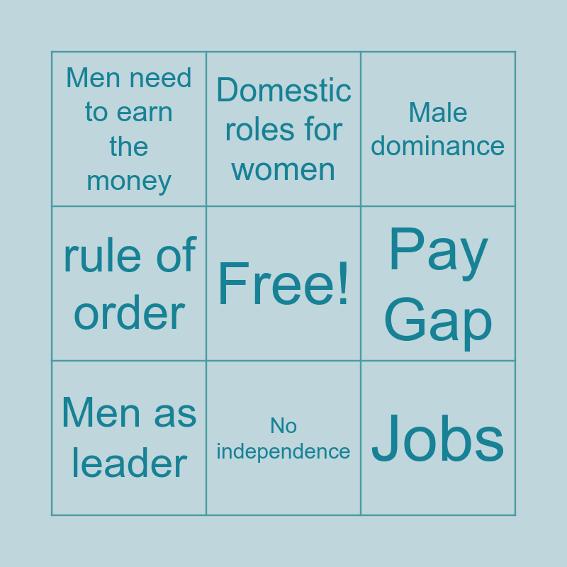 This bingo card has a free space and 8 words: Pay Gap, Male dominance, Domestic roles for women, Men as leader, Men need to earn the money, Jobs, rule of order and No independence.
