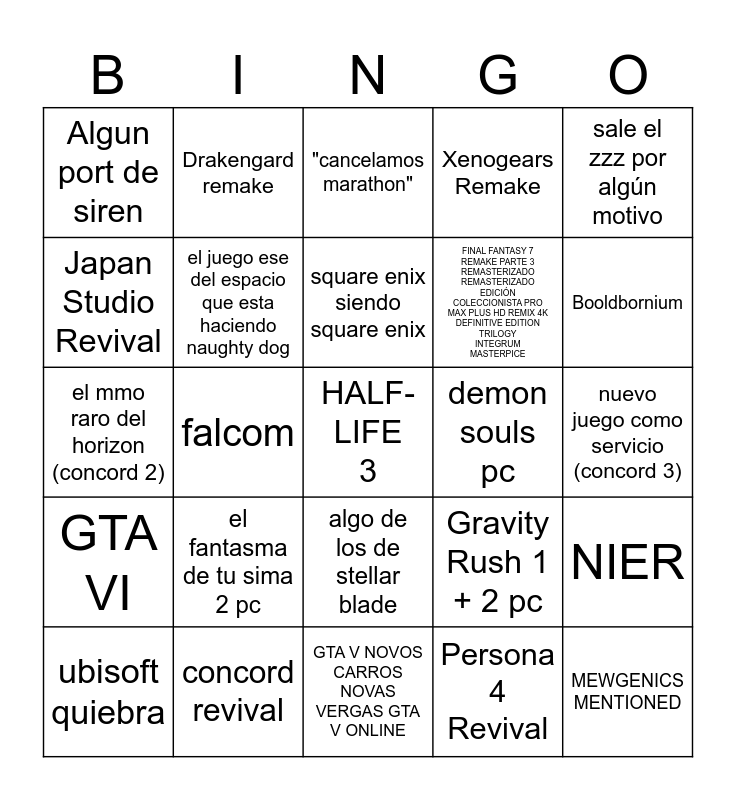 This bingo card has 25 words: el fantasma de tu sima 2 pc, GTA V NOVOS CARROS NOVAS VERGAS GTA V ONLINE, square enix siendo square enix, ubisoft quiebra, sale el zzz por algún motivo, Algun port de siren, Japan Studio Revival, Drakengard remake, demon souls pc, algo de los de stellar blade, FINAL FANTASY 7 REMAKE PARTE 3 REMASTERIZADO REMASTERIZADO EDICIÓN COLECCIONISTA PRO MAX PLUS HD REMIX 4K DEFINITIVE EDITION TRILOGY INTEGRUM MASTERPICE, el mmo raro del horizon (concord 2), Gravity Rush 1 + 2 pc, NIER, el juego ese del espacio que esta haciendo naughty dog, MEWGENICS MENTIONED, nuevo juego como servicio (concord 3), "cancelamos marathon", Booldbornium, falcom, HALF-LIFE 3, concord revival, GTA VI, Xenogears Remake and Persona 4 Revival.