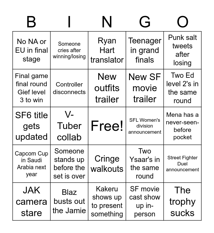 This bingo card has a free space and 24 words: Someone stands up before the set is over, Blaz busts out the Jamie, New outfits trailer, JAK camera stare, Punk salt tweets after losing, No NA or EU in final stage, Final game final round Gief level 3 to win, Someone cries after winning/losing, SFL Women's division announcement, Cringe walkouts, New SF movie trailer, SF6 title gets updated, Two Ysaar's in the same round, Street Fighter Duel announcement, Controller disconnects, SF movie cast show up in-person, Mena has a never-seen-before pocket, Ryan Hart translator, Two Ed level 2's in the same round, V-Tuber collab, The trophy sucks, Capcom Cup in Saudi Arabia next year, Teenager in grand finals and Kakeru shows up to present something.