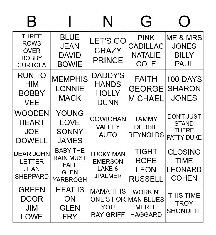 This bingo card has a free space and 24 words: BABY THE RAIN MUST FALL GLEN YARBROGH, HEAT IS ON GLEN FRY, DADDY'S HANDS HOLLY DUNN, GREEN DOOR JIM LOWE, ME & MRS JONES BILLY PAUL, THREE ROWS OVER BOBBY CURTOLA, RUN TO HIM BOBBY VEE, BLUE JEAN DAVID BOWIE, TAMMY DEBBIE REYNOLDS, LUCKY MAN EMERSON LAKE & JPALMER, FAITH GEORGE MICHAEL, WOODEN HEART JOE DOWELL, TIGHT ROPE LEON RUSSELL, CLOSING TIME LEONARD COHEN, MEMPHIS LONNIE MACK, WORKIN' MAN BLUES MERLE HAGGARD, DON'T JUST STAND THERE PATTY DUKE, LET'S GO CRAZY PRINCE, 100 DAYS SHARON JONES, YOUNG LOVE SONNY JAMES, THIS TIME TROY SHONDELL, DEAR JOHN LETTER JEAN SHEPPARD, PINK CADILLAC NATALIE COLE and MAMA THIS ONE'S FOR YOU RAY GRIFF.