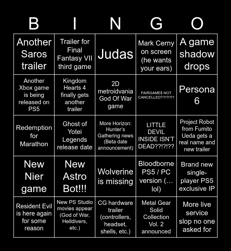 This bingo card has a free space and 24 words: New Astro Bot!!!, New PS Studio movies appear (God of War, Helldivers, etc.), 2D metroidvania God Of War game, Resident Evil is here again for some reason, A game shadow drops, Another Saros trailer, Another Xbox game is being released on PS5, Trailer for Final Fantasy VII third game, LITTLE DEVIL INSIDE ISN’T DEAD??!?!??, Wolverine is missing, FAIRGAME$ NOT CANCELLED??!?!?!?, Redemption for Marathon, Bloodborne PS5 / PC version (…lol), Brand new single-player PS5 exclusive IP, Kingdom Hearts 4 finally gets another trailer, Metal Gear Solid Collection Vol. 2 announced, Project Robot from Fumito Ueda gets a real name and new trailer, Judas, Persona 6, Ghost of Yotei Legends release date, More live service slop no one asked for, New Nier game, Mark Cerny on screen (he wants your ears) and CG hardware trailer (controllers, headset, shells, etc.).