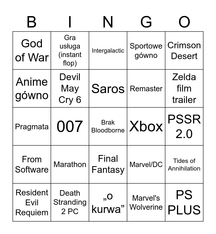 This bingo card has a free space and 24 words: Marathon, Death Stranding 2 PC, Saros, Resident Evil Requiem, Crimson Desert, God of War, Anime gówno, Gra usługa (instant flop), Xbox, Final Fantasy, Remaster, Pragmata, Marvel/DC, Tides of Annihilation, Devil May Cry 6, Marvel's Wolverine, PSSR 2.0, Intergalactic, Zelda film trailer, 007, PS PLUS, From Software, Sportowe gówno and „o kurwa”.