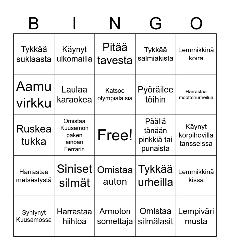 This bingo card has a free space and 24 words: Siniset silmät, Harrastaa hiihtoa, Katsoo olympialaisia, Syntynyt Kuusamossa, Lemmikkinä koira, Tykkää suklaasta, Aamu virkku, Käynyt ulkomailla, Päällä tänään pinkkiä tai punaista, Omistaa auton, Pyöräilee töihin, Ruskea tukka, Tykkää urheilla, Lemmikkinä kissa, Laulaa karaokea, Omistaa silmälasit, Käynyt korpihovilla tansseissa, Pitää tavesta, Harrastaa moottoriurheilua, Omistaa Kuusamon paken ainoan Ferrarin, Lempiväri musta, Harrastaa metsästystä, Tykkää salmiakista and Armoton somettaja.
