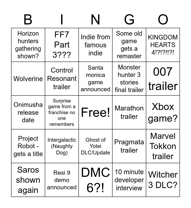 This bingo card has a free space and 24 words: Intergalactic (Naughty Dog), Resi 9 demo announced, Santa monica game announced, Saros shown again, KINGDOM HEARTS 4!?!?!!?!, Horizon hunters gathering shown?, Wolverine, FF7 Part 3???, Marathon trailer, Ghost of Yotei DLC/Update, Monster hunter 3 stories final trailer, Onimusha release date, Pragmata trailer, Marvel Tokkon trailer, Control Resonant trailer, 10 minute developer interview, Xbox game?, Indie from famous indie, 007 trailer, Surprise game from a franchise no one remembers, Witcher 3 DLC?, Project Robot - gets a title, Some old game gets a remaster and DMC 6?!.