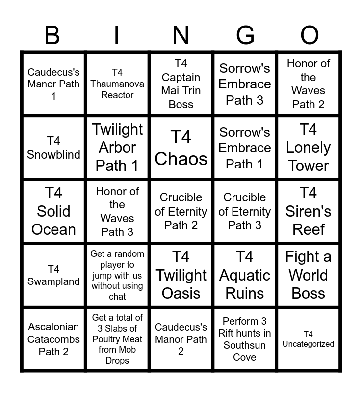 This bingo card has 56 words: Ascalonian Catacombs Path 1, Ascalonian Catacombs Path 2, Ascalonian Catacombs Path 3, Caudecus's Manor Path 1, Caudecus's Manor Path 2, Caudecus's Manor Path 3, Twilight Arbor Path 1, Twilight Arbor Path 2, Sorrow's Embrace Path 1, Sorrow's Embrace Path 2, Sorrow's Embrace Path 3, Citadel of Flame Path 1, Free!, Citadel of Flame Path 2, Citadel of Flame Path 3, Honor of the Waves Path 1, Honor of the Waves Path 2, Honor of the Waves Path 3, Crucible of Eternity Path 1, Crucible of Eternity Path 2, Crucible of Eternity Path 3, T4 Aetherblade, T4 Aquatic Ruins, T4 Captain Mai Trin Boss, T4 Cliffside, T4 Chaos, T4 Deepstone, T4 Kinfall, T4 Lonely Tower, T4 Molten Boss, T4 Molten Furnace, T4 Nightmare, T4 Shattered Observatory, T4 Silent Surf, T4 Siren's Reef, T4 Snowblind, T4 Solid Ocean, T4 Sunqua Peak, T4 Swampland, T4 Thaumanova Reactor, T4 Twilight Oasis, T4 Uncategorized, T4 Underground Facility, T4 Urban Battleground, T4 Volcanic, Get a random player to jump with us without using chat, Get a total of 3 Slabs of Poultry Meat from Mob Drops, Quickplay Raid (encounter), Perform 1 Rift hunt in Southsun Cove, Perform 2 Rift hunts in Southsun Cove, Perform 3 Rift hunts in Southsun Cove, Perform 1 Rift hunt in Cursed Shore, Perform 2 Rift hunts in Cursed Shore, Perform 3 Rift hunts in Cursed Shore, Fight a World Boss and Play a match of GW2 Geo-Guessr.