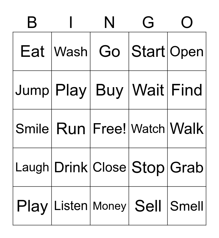 This bingo card has a free space and 24 words: Drink, Listen, Buy, Play, Open, Eat, Jump, Wash, Watch, Close, Wait, Smile, Stop, Grab, Play, Sell, Walk, Go, Find, Run, Smell, Laugh, Start and Money.