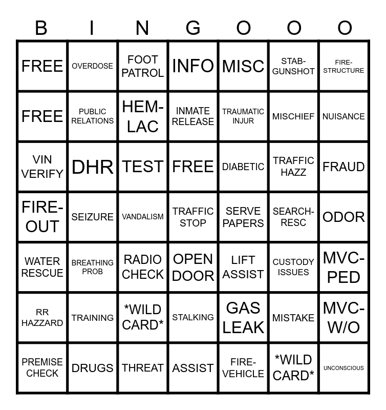 This bingo card has 148 words: Free!, REPO, FIRE-TRAIN, INMATE TRPT, MVC-PED, DIABETIC, MUTUAL AID, ANIMAL COMP, MISSING, CARDIAC ARREST, CARBON MONO, MVC-UNKN, ABD PAIN, FALL, UNAUTH USE, MED ALARM, LIFT ASSIST, PREG-BIRTH, SERVICE CALL, *WILD CARD*, HEART PROB, TRAFFIC HAZZ, POWER OUTAGE, STALKING, BREAK IN, TRAUMATIC INJUR, OVERDOSE, FLOODING, MED STANDBY, 911 ADDRESS, SEARCH-RESC, *WILD CARD*, MVC-W/O, VIN VERIFY, RR HAZZARD, MVC-INJURIES, CHOKING, TRESPASS, PUBLIC RELATIONS, WANTED, THREAT, ABDUCTION, FREE, 10-100, ROAD OP-CL, *WILD CARD*, WRECKER REQ, INDECENT EX, PREMISE CHECK, THEFT, UNKNOWN, FIRE-VEHICLE, FRAUD, SUPPLEMENTAL, COURTESY RIDE, DOMESTIC, NEGLECT, FREE, HEADACHE, SMOKE INV, FOOT PATROL, TRAFFIC STOP, VANDALISM, DROWNING, ANIMAL BITE, NUISANCE, DHR, ABUSE, ANI/ALI, PUBLIC SERVICE, TRAINING, OPEN DOOR, FREE, SUSPICIOUS, BURNS, HARASS, EYE PROBLEMS, FUEL-SPILL, WATER RESCUE, INFO, WATER CRAFT, DRUGS, FIRE ALARM, DISTURBANCE, CUSTODY ISSUES, ADMIN, HEAT-COLD, FREE, UNCONSCIOUS, SEIZURE, CHEST PAIN, CONF SPACE ENTRY, MENTAL PT, MAINT, FIRE-OUT, DRILL, WEAPONS, ATV ACCIDENT, TRAFFIC LIGHT, BACK PAIN, TREE DOWN, RADIO CHECK, STAB-GUNSHOT, ALARM, FLAG DOWN, WELFARE CHECK, ESCORT, CONTROL BURN, ASSAULT, ABANDON, DAMAGED PROP, ROBBERY, TRAFFIC COMP, FIRE-STRUCTURE, TEST, WEATHER, HEM-LAC, BREATHING PROB, MISCHIEF, MISC, MVC-TRAIN, INMATE RELEASE, FOUND PERSON, ALT MENTAL, FREE, PT TRANSFER, SICK PERSON, *WILD CARD*, STROKE, UTILITIES, SERVE PAPERS, INQUIRY, EXTRA PATROL, DOA/DOS, BOLO, MISTAKE, REPORT, ALLERGIC REAC, H-O-W, GAS LEAK, ASSIST, RR OP-CL, FIRE-GRASS, *WILD CARD*, ODOR, FREE, STANDBY and SINKING VEHICLE.