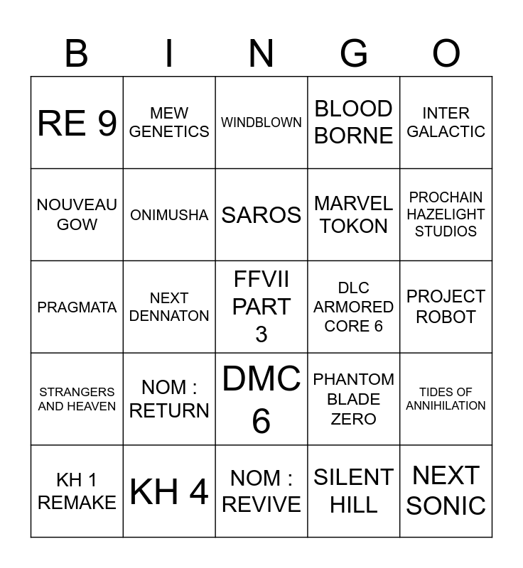 This bingo card has a free space and 24 words: NOM : RETURN, KH 4, SAROS, KH 1 REMAKE, INTER GALACTIC, RE 9, NOUVEAU GOW, MEW GENETICS, DLC ARMORED CORE 6, DMC 6, MARVEL TOKON, PRAGMATA, PHANTOM BLADE ZERO, TIDES OF ANNIHILATION, ONIMUSHA, SILENT HILL, PROJECT ROBOT, WINDBLOWN, PROCHAIN HAZELIGHT STUDIOS, NEXT DENNATON, NEXT SONIC, STRANGERS AND HEAVEN, BLOOD BORNE and NOM : REVIVE.