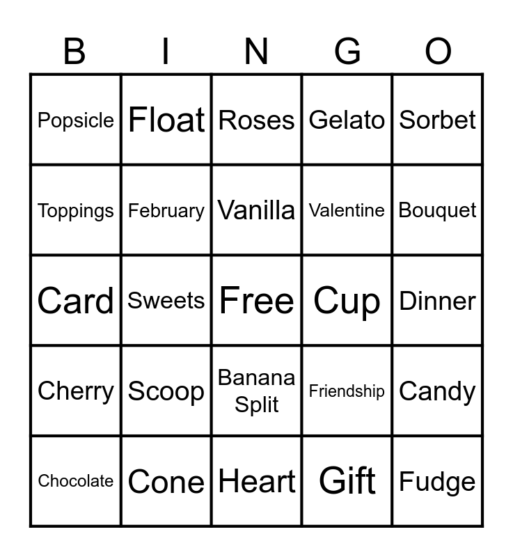 This bingo card has a free space and 24 words: Scoop, Cone, Vanilla, Chocolate, Sorbet, Popsicle, Toppings, Float, Cup, Banana Split, Valentine, Card, Friendship, Candy, February, Gift, Dinner, Roses, Bouquet, Sweets, Fudge, Cherry, Gelato and Heart.