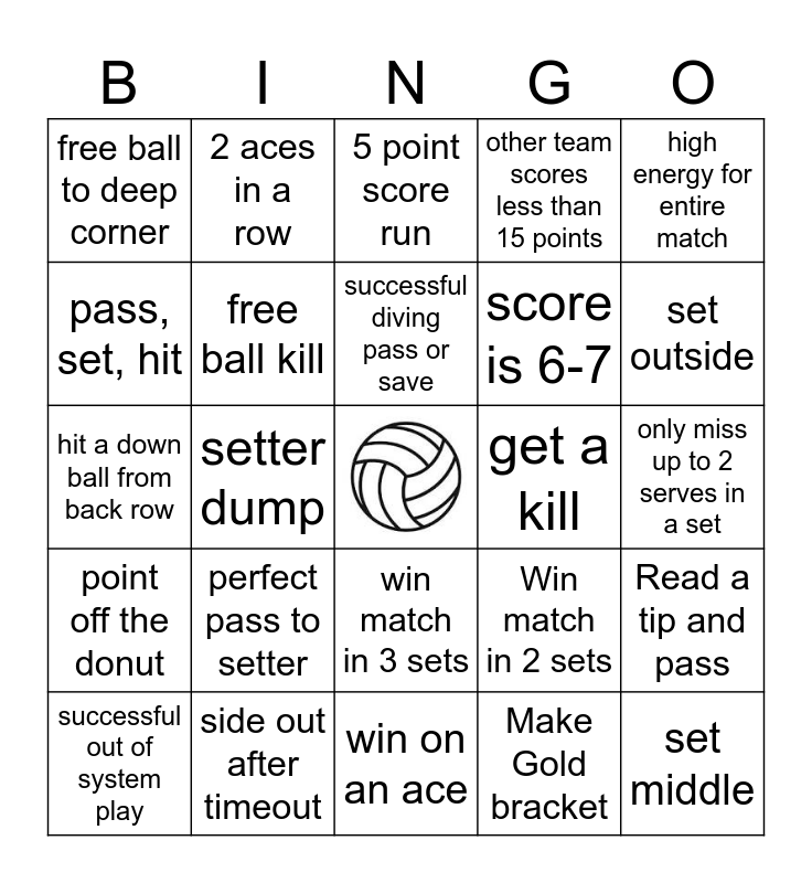 This bingo card has a free space and 24 words: perfect pass to setter, side out after timeout, successful diving pass or save, successful out of system play, high energy for entire match, free ball to deep corner, pass, set, hit, 2 aces in a row, get a kill, win match in 3 sets, score is 6-7, hit a down ball from back row, Win match in 2 sets, Read a tip and pass, free ball kill, Make Gold bracket, only miss up to 2 serves in a set, 5 point score run, set outside, setter dump, set middle, point off the donut, other team scores less than 15 points and win on an ace.