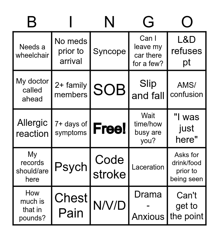 This bingo card has a free space and 24 words: Psych, Chest Pain, SOB, How much is that in pounds?, L&D refuses pt, Needs a wheelchair, My doctor called ahead, No meds prior to arrival, Wait time/how busy are you?, Code stroke, Slip and fall, Allergic reaction, Laceration, Asks for drink/food prior to being seen, 2+ family members, Drama -Anxious, "I was just here", Syncope, AMS/ confusion, 7+ days of symptoms, Can't get to the point, My records should/are here, Can I leave my car there for a few? and N/V/D.