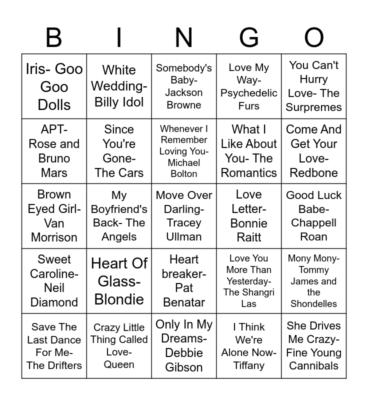 This bingo card has 25 words: Heart Of Glass- Blondie, Only In My Dreams- Debbie Gibson, Whenever I Remember Loving You- Michael Bolton, Save The Last Dance For Me- The Drifters, You Can't Hurry Love- The Surpremes, Iris- Goo Goo Dolls, APT- Rose and Bruno Mars, White Wedding- Billy Idol, Love Letter- Bonnie Raitt, Heart breaker- Pat Benatar, What I Like About You- The Romantics, Brown Eyed Girl- Van Morrison, Love You More Than Yesterday- The Shangri Las, Mony Mony- Tommy James and the Shondelles, Since You're Gone- The Cars, She Drives Me Crazy- Fine Young Cannibals, Good Luck Babe- Chappell Roan, Somebody's Baby- Jackson Browne, Come And Get Your Love- Redbone, My Boyfriend's Back- The Angels, Move Over Darling- Tracey Ullman, Crazy Little Thing Called Love- Queen, Sweet Caroline- Neil Diamond, Love My Way- Psychedelic Furs and I Think We're Alone Now- Tiffany.