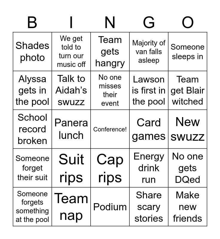This bingo card has a free space and 29 words: Someone forgets something at the pool, Someone tries to step on the lake, Panera lunch, Shaving injury, Shades photo, Team gets hangry, Talk to Aidah’s swuzz, Suit rips, Card games, Team nap, New swuzz, Make new friends, Podium, Share scary stories, Team get Blair witched, Team movie night, Cap rips, Someone forget their suit, Someone sleeps in, School record broken, Energy drink run, Someone throws up after their race, Lawson is first in the pool, Alyssa gets in the pool, Majority of van falls asleep, We get told to turn our music off, No one gets DQed, No one misses their event and Someone gets in the crib.