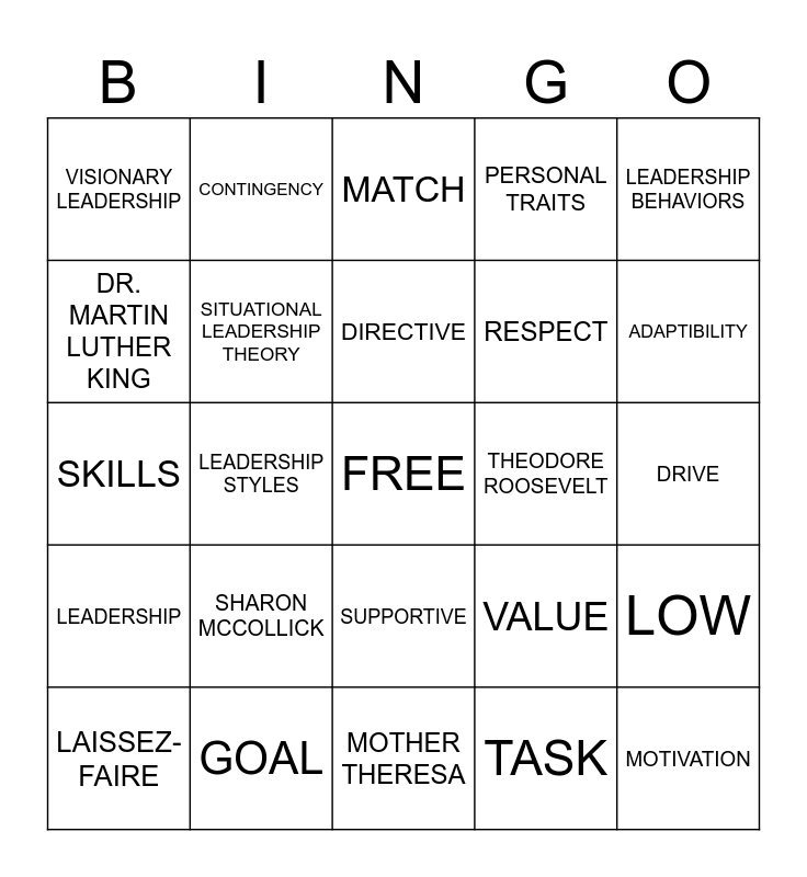 This bingo card has a free space and 39 words: CHARAMATIC LEADERSHIP, TRANSFORMATIONAL, LEADERSHIP THEORIES, SITUATIONAL LEADERSHIP THEORY, LAISSEZ-FAIRE, SUPPORTIVE, DIRECTIVE, PARTICIPATIVE, LEADERSHIP BEHAVIORS, LEADERSHIP, LEADERSHIP STYLES, PERSONAL TRAITS, MOTIVATION, DRIVE, THEODORE ROOSEVELT, SHARON MCCOLLICK, VISION, VISIONARY LEADERSHIP, EMPOWERMENT, VALUE, DR. MARTIN LUTHER KING, MOTHER THERESA, RESPECT, ADAPTIBILITY, PASSION, HUMILITY, DECISIONS, HOUSE, FIEDLER, CONTINGENCY, RESPONSIBILITY, SITUATIONAL, MATCH, GOAL, TASK, HIGH, LOW, SKILLS and TALENT.