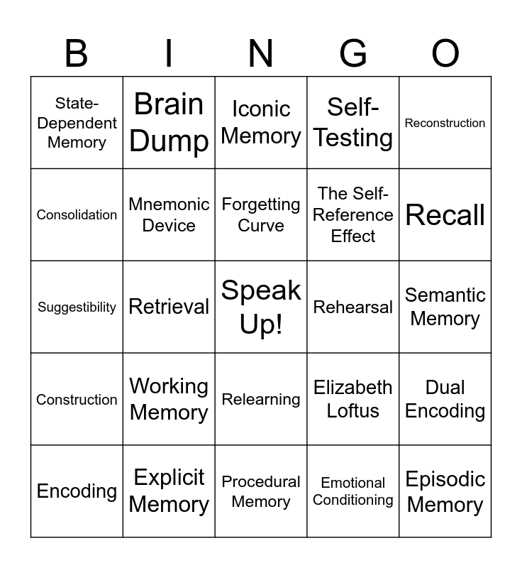 This bingo card has a free space and 29 words: Encoding, Chunking, Retrieval, Effortful Processing, State-Dependent Memory, Iconic Memory, Mnemonic Device, Working Memory, Rehearsal, Explicit Memory, Semantic Memory, Episodic Memory, Procedural Memory, Emotional Conditioning, Recall, Semantic Networks, Relearning, Construction, Reconstruction, Suggestibility, Elizabeth Loftus, Elaboration, The Self-Reference Effect, Consolidation, Self-Testing, Brain Dump, Dual Encoding, Forgetting Curve and Implicit Memory.
