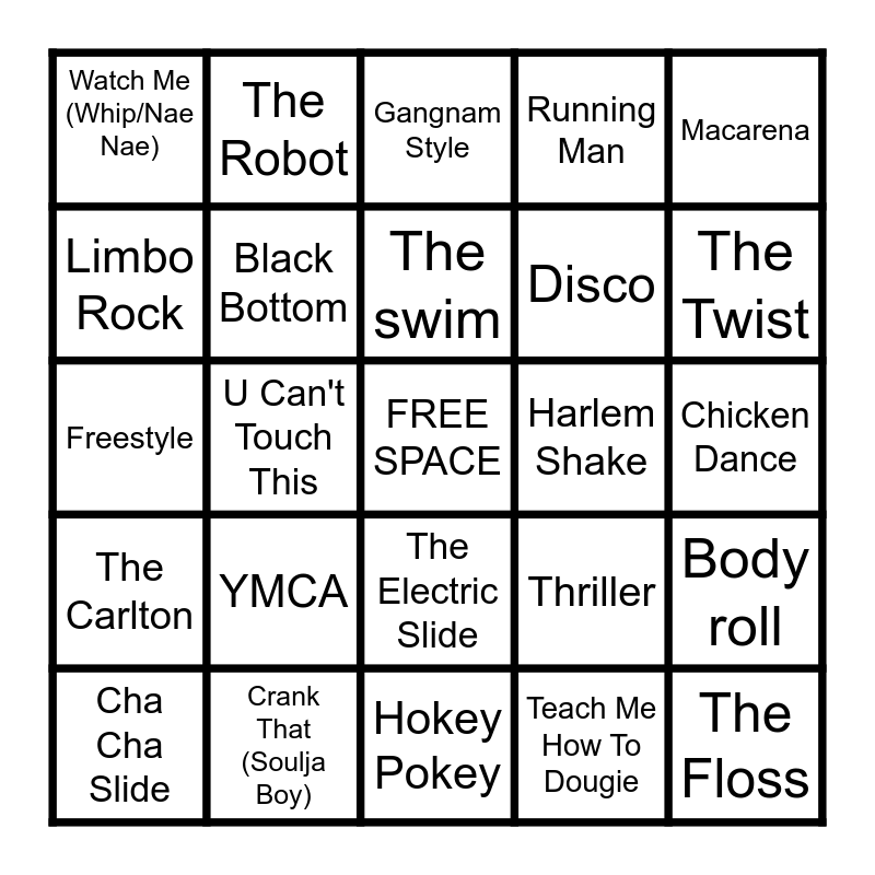This bingo card has a free space and 29 words: Cha Cha Slide, The woah, U Can't Touch This, Wobble, Watch Me (Whip/Nae Nae), Gangnam Style, Black Bottom, YMCA, Harlem Shake, Crank That (Soulja Boy), Chicken Dance, The Floss, Hokey Pokey, Teach Me How To Dougie, The Twist, The fisherman, The Electric Slide, The Carlton, Macarena, Freestyle, Thriller, Moonwalk, Disco, Limbo Rock, Running Man, The Robot, Body roll, The swim and Head & Shoulders.