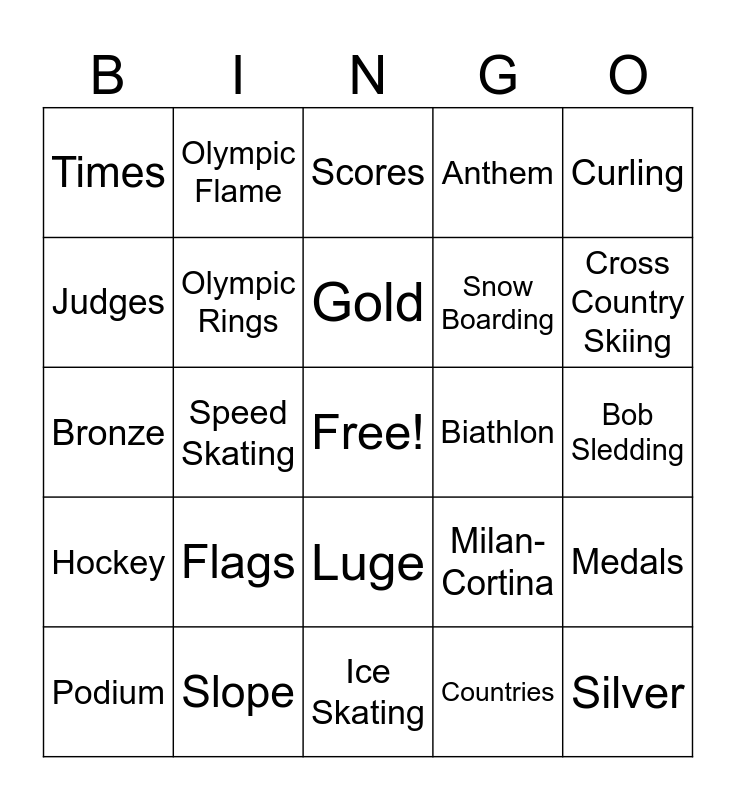 This bingo card has a free space and 24 words: Flags, Slope, Gold, Podium, Curling, Times, Judges, Olympic Flame, Biathlon, Luge, Snow Boarding, Bronze, Milan-Cortina, Medals, Olympic Rings, Countries, Bob Sledding, Scores, Cross Country Skiing, Speed Skating, Silver, Hockey, Anthem and Ice Skating.