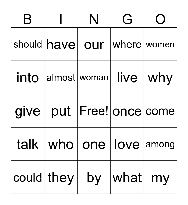 This bingo card has a free space and 24 words: who, they, woman, could, women, should, into, have, once, one, live, give, love, among, almost, what, come, our, why, put, my, talk, where and by.