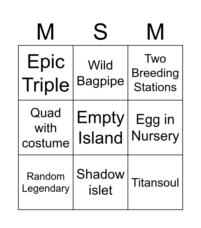 This bingo card has a free space and 8 words: Egg in Nursery, Two Breeding Stations, Wild Bagpipe, Random Legendary, Epic Triple, Titansoul, Quad with costume and Shadow islet.