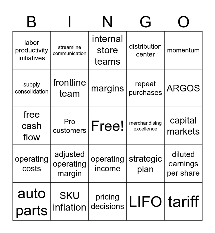 This bingo card has a free space and 39 words: forward-looking statements, initiatives, guidance, frontline team, auto parts, operating income, margins, store investments, momentum, operating costs, Pro customers, distribution center, tariff, capital markets, merchandising excellence, adjusted operating margin, margin expansion, labor productivity initiatives, value creation, strategic plan, supply consolidation, pricing decisions, repeat purchases, ARGOS, PRO, DIY, Advance Rewards, store network, market hubs, streamline communication, collaboration, sales team, internal store teams, SKU inflation, LIFO, SG&A, diluted earnings per share, free cash flow and debt leverage.