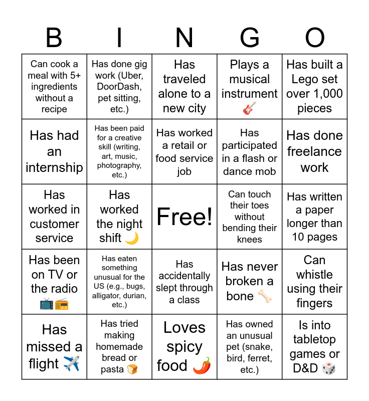 This bingo card has a free space and 74 words: Has visited at least 3 different countries, Has taken a road trip longer than 10 hours, Has traveled alone to a new city, Has been to a US national park, Speaks more than one language fluently, Has been on a cruise π’, Has visited a historical landmark outside their home country, Has flown on a standby ticket, Has missed a flight βοΈ, Has lived in more than two different states or countries, Has been to a festival or concert in another country, Has ridden a train in another country, Has worked a retail or food service job, Has had an internship, Has worked a side hustle or gig work, Has worked the night shift π, Has had a job that required wearing a uniform, Has done freelance work, Has been a camp counselor or tutor, Has worked in customer service, Has been paid for a creative skill (writing, art, music, photography, etc.), Has done gig work (Uber, DoorDash, pet sitting, etc.), Plays a musical instrument πΈ, Enjoys crocheting, knitting, or sewing π§Ά, Is into tabletop games or D&D π², Has taken a dance class or learned a dance routine π, Has completed a 5K, marathon, or fitness challenge π, Knows how to do a magic trick, Has published a short story, poem, or song, Enjoys rock climbing, hiking, or camping, Has built a Lego set over 1,000 pieces, Has participated in a competitive eSports or gaming tournament, Has more than one pet, Has a cat π±, Has a dog πΆ, Has owned an unusual pet (snake, bird, ferret, etc.), Volunteered at an animal shelter, Is allergic to cats or dogs, Has rescued an injured animal, Has gone horseback riding π΄, Loves spicy food πΆοΈ, Has tried making homemade bread or pasta π, Drinks at least 2 cups of coffee a day β, Prefers tea over coffee π΅, Is a vegetarian or vegan π±, Can cook a meal with 5+ ingredients without a recipe, Can eat with chopsticks proficiently π₯’, Has eaten something unusual for the US (e.g., bugs, alligator, durian, etc.), Has changed their major at least once, Has pulled an all-nighter for an exam or paper, Has presented at a conference or academic event, Has worked in a campus lab, library, or student center, Has written a paper longer than 10 pages, Uses a planner or digital calendar religiously π , Has been in a group project where someone didnβt do their part, Uses a color-coded system for notes, Has accidentally slept through a class, Has met a celebrity π, Knows how to juggle π€Ή, Can whistle using their fingers, Has participated in a flash or dance mob, Has solved a Rubikβs cube, Has been on TV or the radio πΊπ», Has a tattoo or piercing (besides ears), Can touch their toes without bending their knees, Can say the alphabet backward, Can do a handstand or cartwheel π€Έ, Has broken a bone π¦΄, Has never broken a bone π¦΄, Can name all 50 U.S. states from memory, Has never had a cavity π¦·, Can do an impression of a celebrity or cartoon character, Can hold their breath for over a minute and Can write with both hands (ambidextrous).