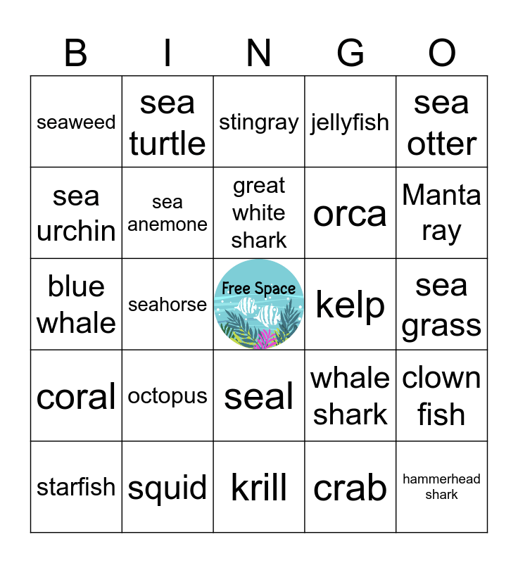 This bingo card has a free space and 24 words: octopus, squid, great white shark, starfish, sea otter, seaweed, sea urchin, sea turtle, kelp, seal, orca, blue whale, whale shark, clown fish, sea anemone, crab, sea grass, stingray, Manta ray, seahorse, hammerhead shark, coral, jellyfish and krill.