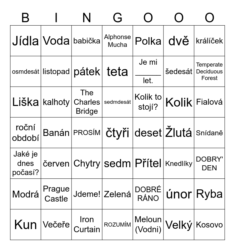 This bingo card has 210 words: Free!, Zvirat, Žlutá, Zlatá, zima, Zelená, září, Zabava, žába, Voda, Vltava, Vlk, Velký, večeře, Večeře, úterý, únor, třináct, třicet, tři, Toaleta, tisíc, The Velvet Revolution, The Crown/Koruna, The Charles Bridge, teta, Těší mě. (tyeh-sheee mnyeh), Teplo, Temperate Deciduous Forest, Svíčková, svačinka, Svačina, strýc, Stříbrná, středa, sto, Šťastný novy rok!, starší, srpen, Špatné, sobota, snídaně, Snídaně, Sněží, Sluneční svit, Škola, sestřenice, sestra, šestnáct, šest, sedmnáct, sedmdesát, sedm, šedesát, Šedá, Ryba, Růžová, ROZUMÍM, rodina, Rodina, roční období, Říp, říjen, Q, W, X, prosinec, PROSÍM, Promiňte, Přítel, Prague or Praha, Prague Castle, pondělí, Pomeranč, Polka, podzim, Počasí, pět, Pes, patnáct, pátek, padesát, Ovoce, Otužilec, Otto Wichterle, otec, osmnáct, osmdesát, osm, Oříškové, Oranžová, oběd, Oběd, nula, Nový, NEROZUMÍM, Nemáš Zač, neděle, Ne, NA SHLEDANOU, Myš, Modrá, MLUVÍTE ANGLICKY?, mladší, milión, Meloun (Vodni), matka, Málo, Lituji (lituyi), listopad, Liška, Limetka, léto, leden, Laska, květen, Kuře, Kun, Krtek, Krava, Krasy, Krásný, králíček, Kosovo, košile, Kolik to stojí?, Kolik, Koláče, Kočka, Knedlíky, Kde je ........?, Kde, kalhoty, Josef Capek, JMENUJI SE ____., Jídla, jedna, jedenáct, Je zima, Je mi ______ let., Jdeme!, jaro, Jan Jansky, Jaké je dnes počasí?, Jaka je to barva?, JAK SE MÁTE?, Jak, Jablko, Iron Curtain, Hnědá, hladový, Hladovy, guláš, Gregor Mendel, Fialová, dvě, dvanáct, dvacet, duha, duben, DOBRY' DEN, DOBRÉ RÁNO, Dobré, devět, devatenáct, devadesát, déšť, deset, Děkuju, dědeček, čtyřicet, čtyři, čtvrtek, čtrnáct, Communism, Citron, Cihlová, Chytry, Chyba, Chutney, Chleba, Chladno, červenec, Červená, červen, Černá, Bulgaria, Bronzová, březen, bratranec, bratr, Bohemia, Moravia and Silesia, Blondýnka, Bíla, Berlin Wall, barvy/barva, Banán, babička, Auto, Atonin Dvořak, Astronomical Clock - Orloj, Ano, Ananas, Alphonse Mucha, Ahoj or čao, 7 (counting Kosovo), 5000 years, 100,000 years, 1989, 15, 13 and 6.