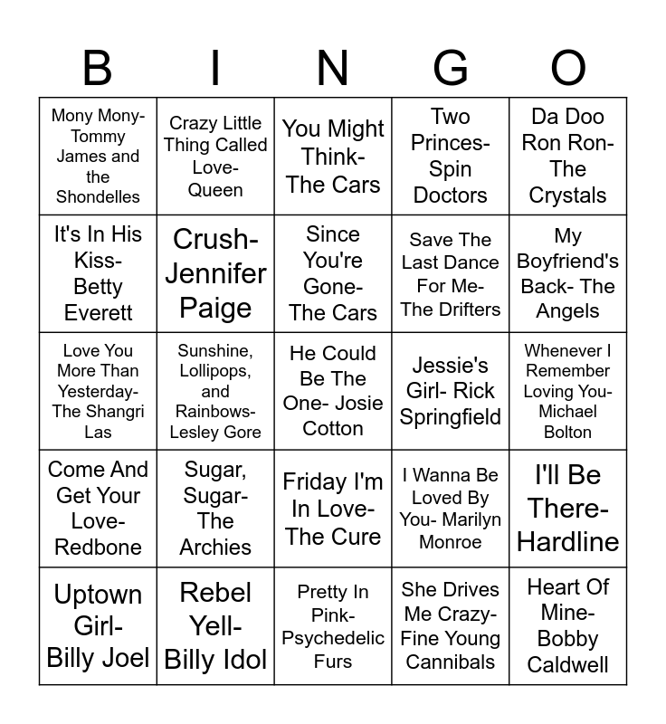 This bingo card has 25 words: Sugar, Sugar- The Archies, Pretty In Pink- Psychedelic Furs, Since You're Gone- The Cars, Uptown Girl- Billy Joel, Da Doo Ron Ron- The Crystals, Mony Mony- Tommy James and the Shondelles, It's In His Kiss- Betty Everett, Crazy Little Thing Called Love- Queen, Jessie's Girl- Rick Springfield, Friday I'm In Love- The Cure, Save The Last Dance For Me- The Drifters, Love You More Than Yesterday- The Shangri Las, I Wanna Be Loved By You- Marilyn Monroe, I'll Be There- Hardline, Crush- Jennifer Paige, Heart Of Mine- Bobby Caldwell, Whenever I Remember Loving You- Michael Bolton, You Might Think- The Cars, My Boyfriend's Back- The Angels, Sunshine, Lollipops, and Rainbows- Lesley Gore, He Could Be The One- Josie Cotton, Rebel Yell- Billy Idol, Come And Get Your Love- Redbone, Two Princes- Spin Doctors and She Drives Me Crazy- Fine Young Cannibals.