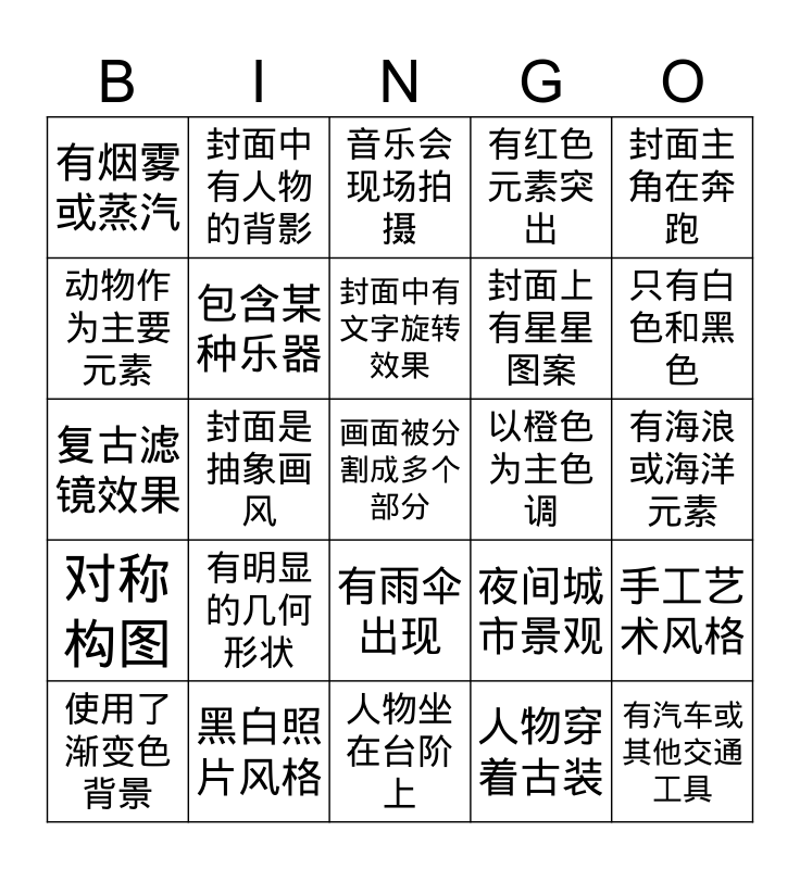 This bingo card has a free space and 24 words: 有明显的几何形状, 黑白照片风格, 封面中有文字旋转效果, 使用了渐变色背景, 封面主角在奔跑, 有烟雾或蒸汽, 动物作为主要元素, 封面中有人物的背影, 以橙色为主色调, 有雨伞出现, 封面上有星星图案, 复古滤镜效果, 夜间城市景观, 手工艺术风格, 包含某种乐器, 人物穿着古装, 有海浪或海洋元素, 音乐会现场拍摄, 只有白色和黑色, 封面是抽象画风, 有汽车或其他交通工具, 对称构图, 有红色元素突出 and 人物坐在台阶上.