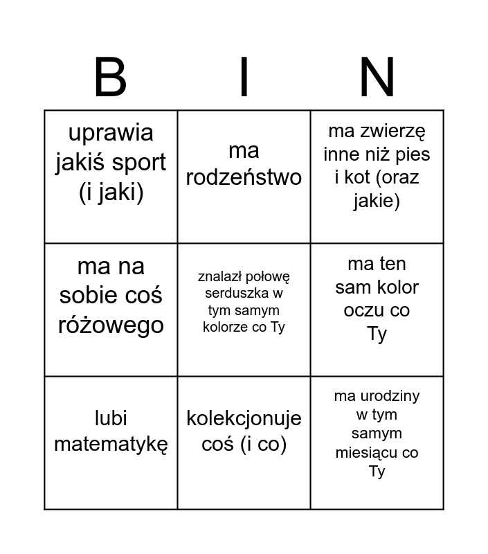 This bingo card has a free space and 8 words: ma ten sam kolor oczu co Ty, ma zwierzę inne niż pies i kot (oraz jakie), ma rodzeństwo, lubi matematykę, uprawia jakiś sport (i jaki), ma urodziny w tym samym miesiącu co Ty, ma na sobie coś różowego and kolekcjonuje coś (i co).