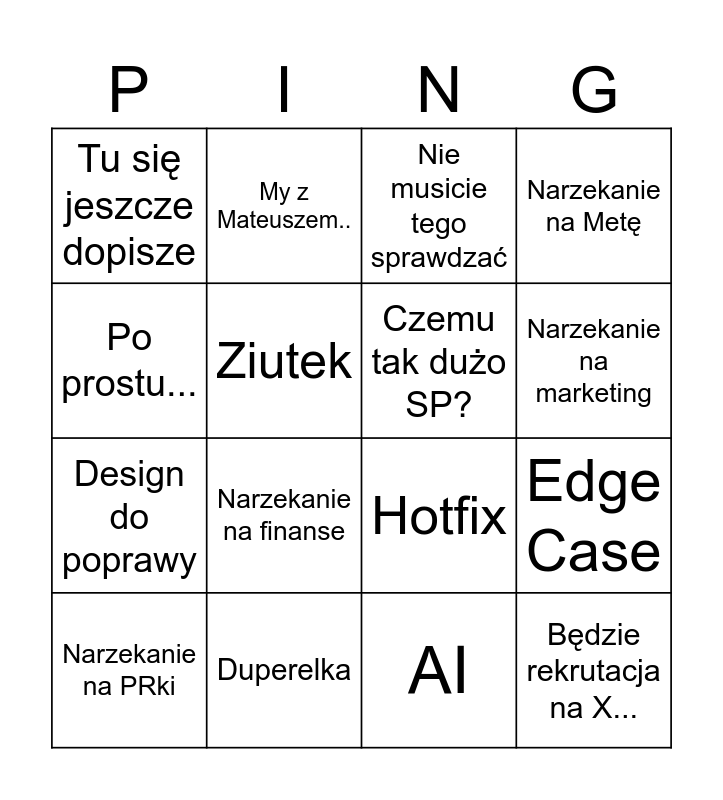 This bingo card has 16 words: Duperelka, Edge Case, Nie musicie tego sprawdzać, Tu się jeszcze dopisze, Design do poprawy, My z Mateuszem.., Hotfix, AI, Po prostu..., Ziutek, Narzekanie na PRki, Narzekanie na Metę, Narzekanie na finanse, Narzekanie na marketing, Czemu tak dużo SP? and Będzie rekrutacja na X....
