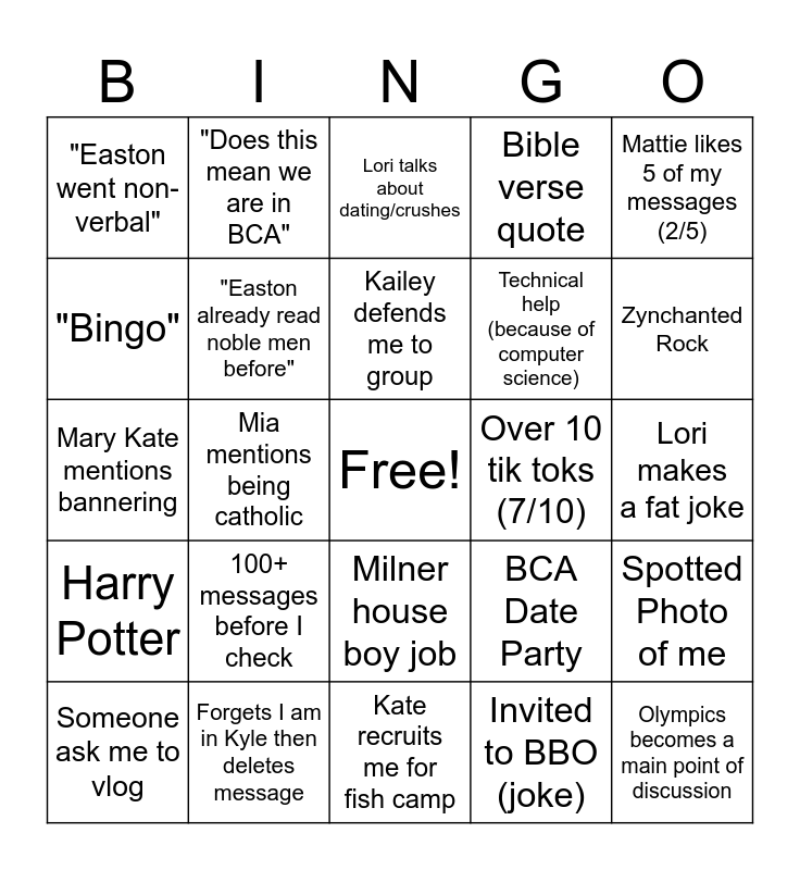 This bingo card has a free space and 24 words: 100+ messages before I check, Forgets I am in Kyle then deletes message, Kailey defends me to group, Someone ask me to vlog, Mattie likes 5 of my messages (2/5), "Easton went non-verbal", "Bingo", "Does this mean we are in BCA", Over 10 tik toks (7/10), Milner house boy job, Technical help (because of computer science), Mary Kate mentions bannering, BCA Date Party, Spotted Photo of me, "Easton already read noble men before", Invited to BBO (joke), Lori makes a fat joke, Lori talks about dating/crushes, Zynchanted Rock, Mia mentions being catholic, Olympics becomes a main point of discussion, Harry Potter, Bible verse quote and Kate recruits me for fish camp.