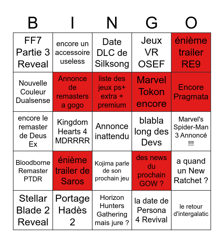 This bingo card has a free space and 24 words: énième trailer de Saros, Portage Hadès 2, liste des jeux ps+ extra + premium, Stellar Blade 2 Reveal, énième trailer RE9, FF7 Partie 3 Reveal, Nouvelle Couleur Dualsense, encore un accessoire useless, blabla long des Devs, Kojima parle de son prochain jeu, Marvel Tokon encore, encore le remaster de Deus Ex, des news du prochain GOW ?, a quand un New Ratchet ?, Annonce de remasters a gogo, la date de Persona 4 Revival, Marvel's Spider-Man 3 Annoncé !!!, Date DLC de Silksong, Encore Pragmata, Kingdom Hearts 4 MDRRRR, le retour d'intergalatic, Bloodborne Remaster PTDR, Jeux VR OSEF and Horizon Hunters Gathering mais jure ?.