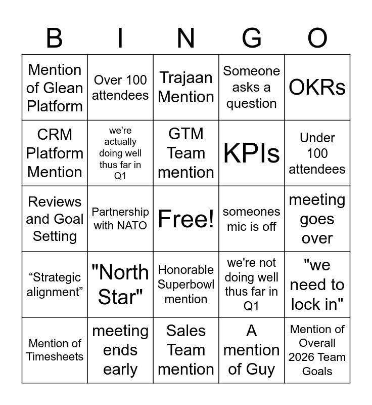 This bingo card has a free space and 24 words: "North Star", meeting ends early, GTM Team mention, Mention of Timesheets, OKRs, Mention of Glean Platform, CRM Platform Mention, Over 100 attendees, someones mic is off, Honorable Superbowl mention, KPIs, Reviews and Goal Setting, we're not doing well thus far in Q1, "we need to lock in", we're actually doing well thus far in Q1, A mention of Guy, meeting goes over, Trajaan Mention, Under 100 attendees, Partnership with NATO, Mention of Overall 2026 Team Goals, “Strategic alignment”, Someone asks a question and Sales Team mention.