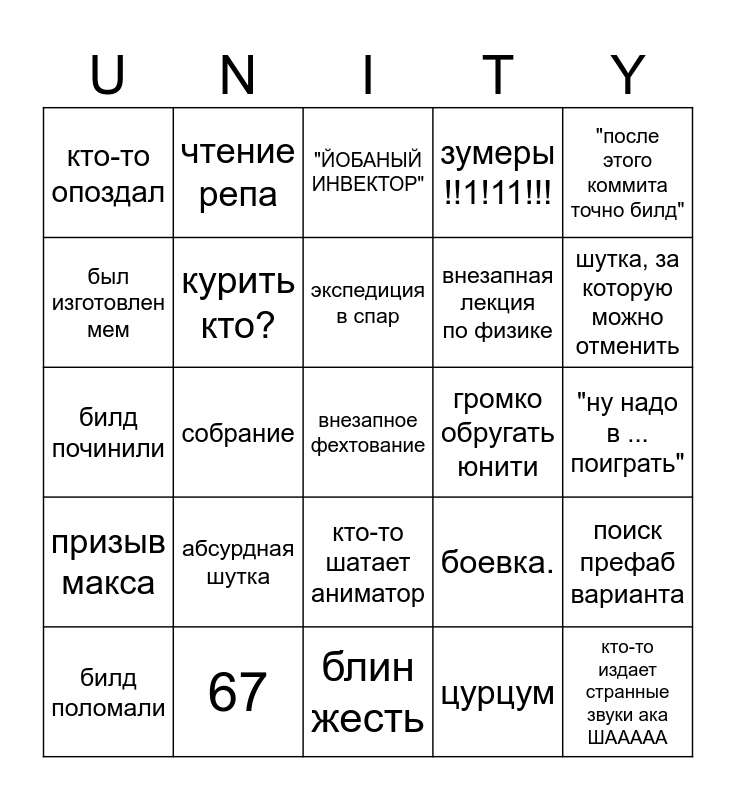 This bingo card has 25 words: призыв макса, 67, внезапное фехтование, цурцум, "после этого коммита точно билд", кто-то опоздал, чтение репа, "ЙОБАНЫЙ ИНВЕКТОР", громко обругать юнити, поиск префаб варианта, был изготовлен мем, курить кто?, блин жесть, боевка., шутка, за которую можно отменить, билд поломали, собрание, экспедиция в спар, внезапная лекция по физике, "ну надо в ... поиграть", билд починили, абсурдная шутка, кто-то шатает аниматор, зумеры !!1!11!!! and кто-то издает странные звуки ака ШААААА.